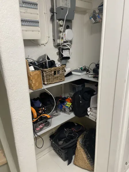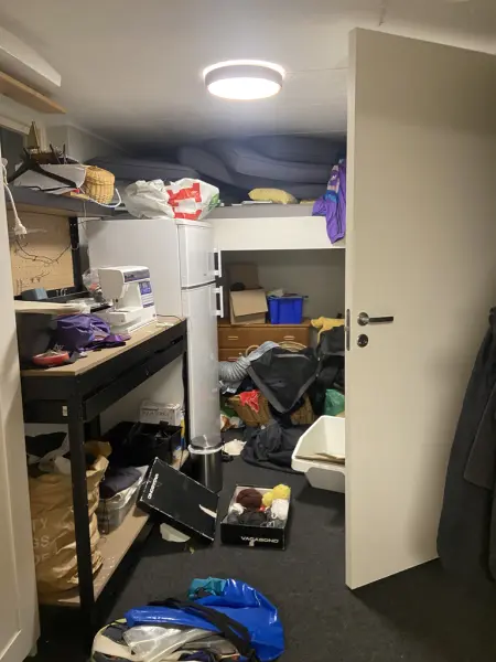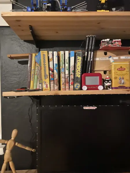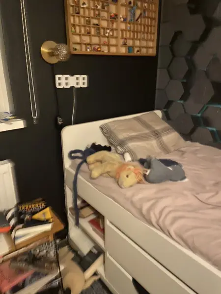 Jag sover i källaren i ett eget rum. Det är ett svart rum med en modellvärld, en dator och massor av LEGO®️. Jag har två fönster och en säng. Jag trivs ganska 👍.